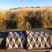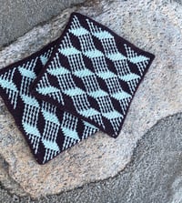 Flotte dobbeltlagede grydelapper i klassisk mønster. De er hæklet rundt i nordisk flerfarvehækling med fastmasker i bagerste maskeled.